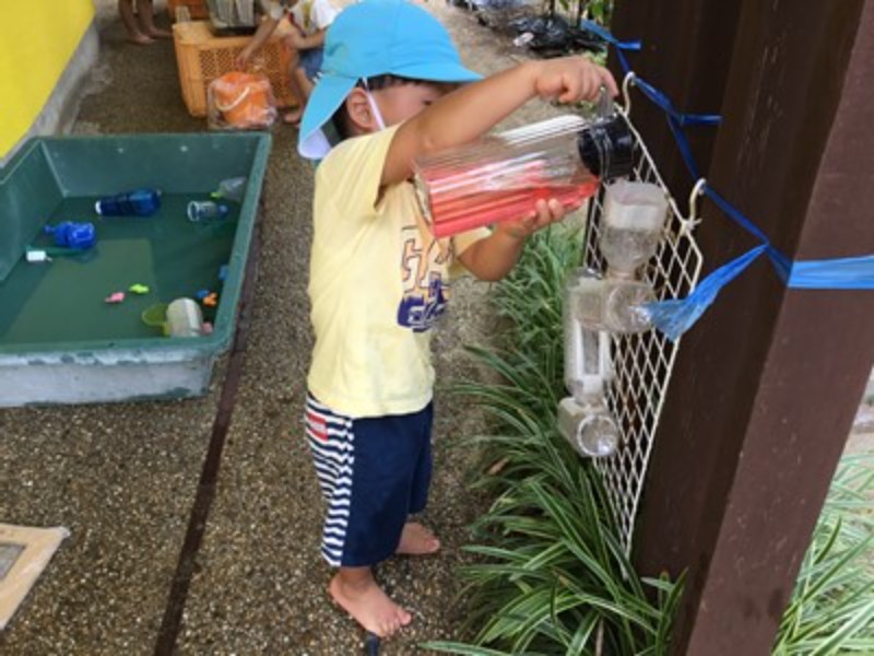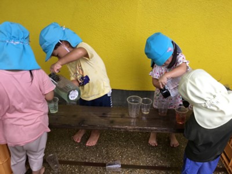 また、色水遊びにも夢中で、色を混ぜて「見て!きれいなジュースができたよ!」と嬉しそうに見せてくれる子どももいました。