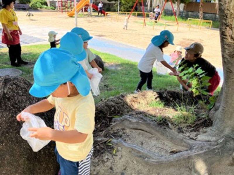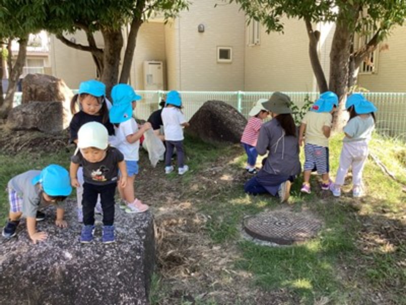 広場の木の下では、どんぐりや落ち葉を見つけて「まるいのあった!」「帽子つきだよ!」と夢中になって集める姿もあり、自然の中での発見を楽しんでいました。
