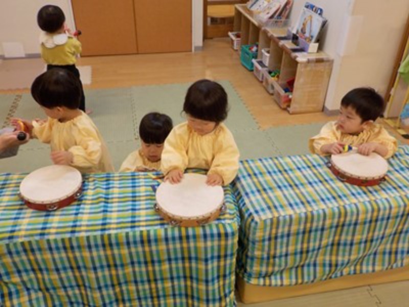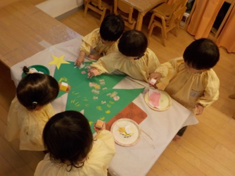 クリスマスツリーを見たり、クリスマスソングに合わせて楽器を鳴らしたり、製作活動でツリーを作ったりしました。