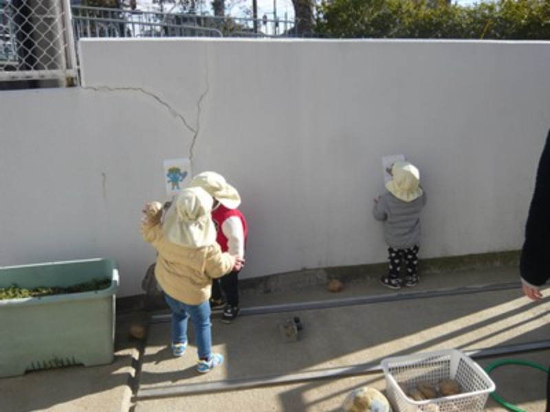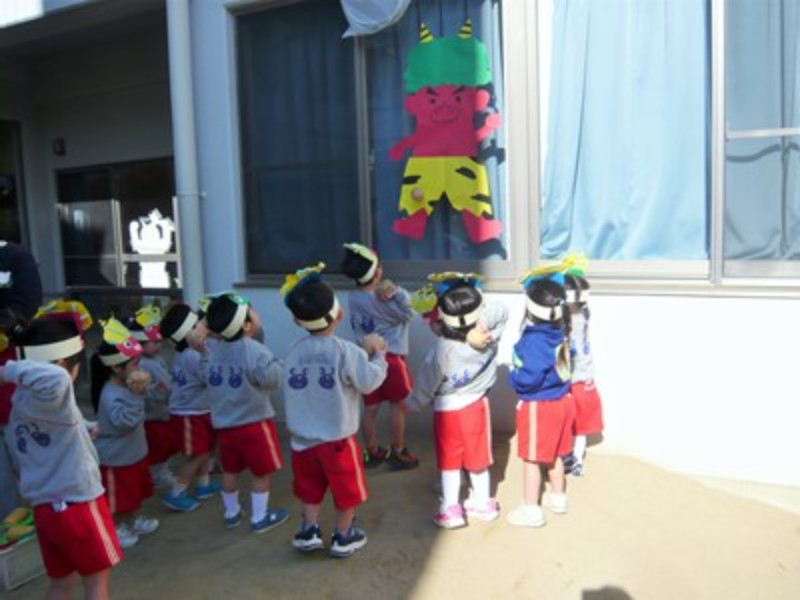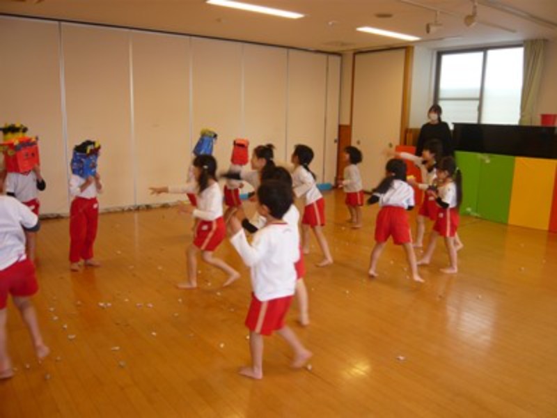 幼児クラスでは「おにはそと!ふくはうち!」と元気な声が園内に響き渡りました。豆まきを楽しみながら、一年間の無病息災を願う事ができました。